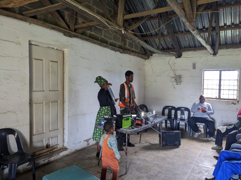 The Amandla Emvelo team addressed the community inside the hall. Our team demonstrated various solar systems and products, explaining how clean, renewable energy can transform daily life for rural households and small businesses.